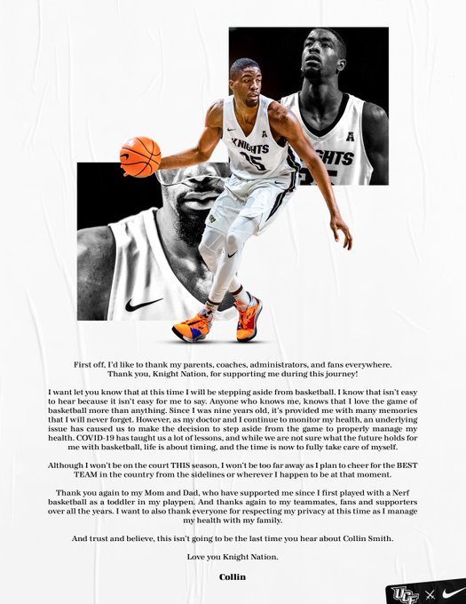 Very mature, responsible decision. Especially so given the acknowledgement of an underlying health condition. Wishing Collin the best and a safe return to the UCF Knights in 2021-22.