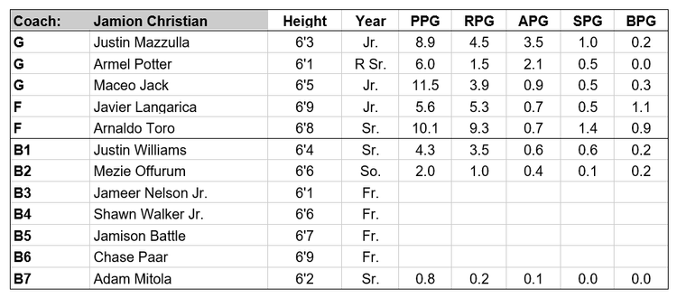 The interior will be manned primarily by three players: Arnaldo Toro, Javier Langarica, and Chase Paar. Toro played seven games last year before having season-ending hip surgery. When he did play, he was fantastic on the glass, a decent shot blocker, and a solid inside scoring presence with face-up capability. In 2017-18, Toro ranked in the A-10’s top ten in both defensive and offensive rebounding rates. Langarica is also a prolific rebounder and a better shot blocker than Toro. He stepped into the lineup when Toro went down last year, but likely won’t share the floor too much with his fellow big given the similarities in their game and Christian’s style. Paar (another Joseph recruit) comes in with glowing praise from Christian and could carve out major minutes in his rookie year.